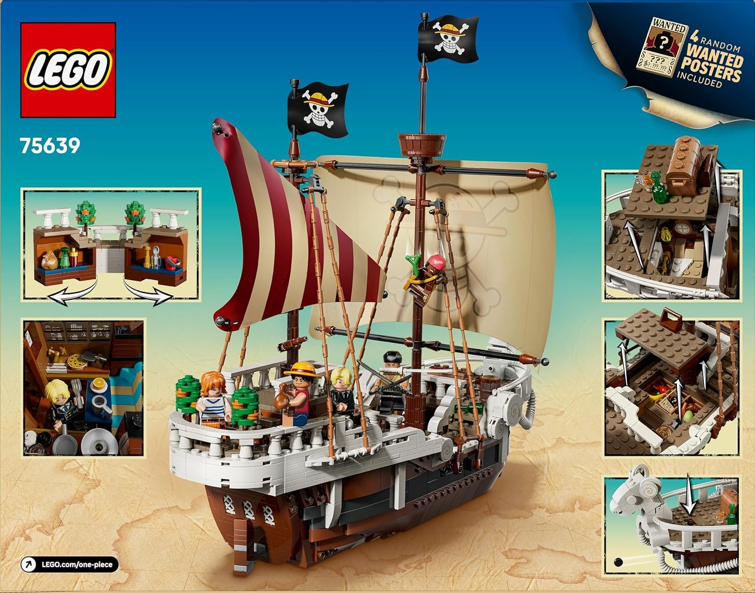 L’iconica nave è dotata di diversi spazi interni: una cabina per l’equipaggio, una cucina, un magazzino e un’officina per gli accessori. Il modello contiene 5 minifigure LEGO ONE PIECE. Luffy siede sulla polena della pecora nella parte anteriore della nave, sotto la quale si trova un cannone; Zoro si rilassa e si allena sul ponte; Nami controlla il timone nella parte posteriore, dove sul ponte crescono i suoi alberi di mandarino preferiti; Usopp si arrampica sugli alberi e fa la guardia dalla coffa; Sanji porta le pentole giù per le scale fino alla cucina. Include 4 poster “Ricercato”. L’app LEGO Builder permette ai bambini di ingrandire, ruotare i modelli in 3D e seguire i progressi. Il set contiene 1.376 pezzi.